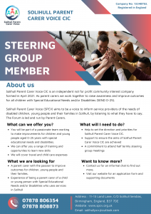 Solihull Parent Carer Voice has vacancies for Steering Group Members, if you would like to join us please see the below information.